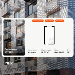 Продаётся квартира-студия площадью 19,9 кв.м на 14 этаже 16 этажного дома (Корпус 41, Секция 1) проекта ПИК ''Восточное Бутово''. Светлый просторный подъезд на уровне земли, функциональная планировка, большие окна, c отделкой. Жилой квартал ''Восточное Бутово'' расположен в 5 км от МКАД по Симферопольскому шоссе, в Ленинском районе Московской области. Это экологически благоприятное место по соседству с Бутовским лесопарком. В 25 минутах на машине - станции метро и МЦД ''Бутово''. В ''Восточном Бутово'' уже открылись пять детских садов из десяти запланированных и одна школа из четырёх. Внутри квартала будет две поликлиники, одна из которых уже работает. В проекте два пешеходных бульвара - по одному из них уже можно гулять и кататься на велосипеде. В закрытых дворах-парках не будет автомобилей - мы построим многоуровневый паркинг, чтобы сделать район ещё более комфортным и безопасным для жителей. Артикул 645811 (Застройщик ООО ''Лотан'')