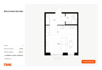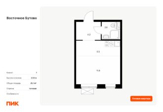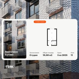 Продаётся квартира-студия площадью 21,8 кв.м на 3 этаже 16 этажного дома (Корпус 42, Секция 3) проекта ПИК ''Восточное Бутово''. Светлый просторный подъезд на уровне земли, функциональная планировка, большие окна, c отделкой. Жилой квартал ''Восточное Бутово'' расположен в 5 км от МКАД по Симферопольскому шоссе, в Ленинском районе Московской области. Это экологически благоприятное место по соседству с Бутовским лесопарком. В 25 минутах на машине - станции метро и МЦД ''Бутово''. В ''Восточном Бутово'' уже открылись пять детских садов из десяти запланированных и одна школа из четырёх. Внутри квартала будет две поликлиники, одна из которых уже работает. В проекте два пешеходных бульвара - по одному из них уже можно гулять и кататься на велосипеде. В закрытых дворах-парках не будет автомобилей - мы построим многоуровневый паркинг, чтобы сделать район ещё более комфортным и безопасным для жителей. Артикул 900025 (Застройщик ООО ''Лотан'')