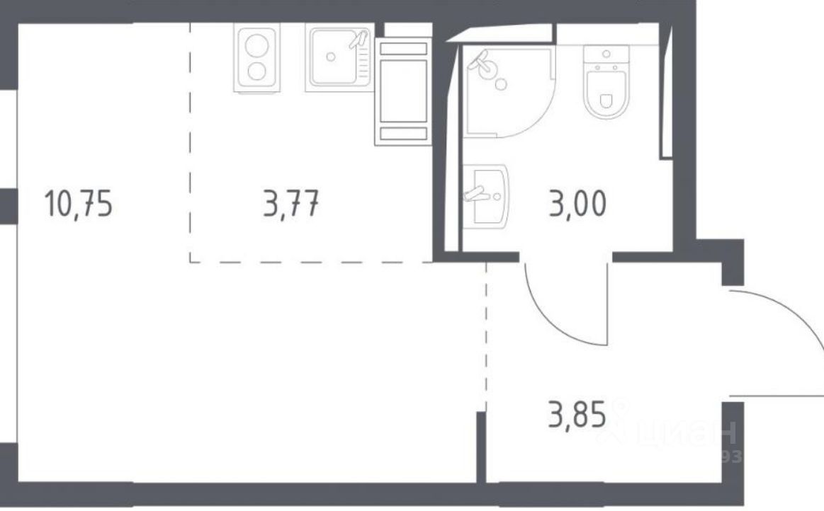 Общая площадь 21,40. Кухня-ниша 3,77. Прихожая 3,89. Санузел 3,03. Студия 10,75. До выдачи ключей будут проведены все коммуникации во всех комнатах, установлена сантехника, межкомнатные двери, окна. В ванной комнате и туалете будет установлена керамическая плитка, в комнатах обои под покраску.
