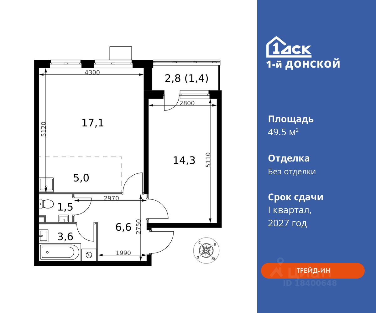 Максимальные скидки при 100% оплате. Trade-in вместо первоначального взноса - выгодно обменяйте вашу квартиру на новую! Прямая продажа от застройщика! Жилой Комплекс класса Комфорт плюс. Продаётся 2-к квартира номер 708 общей площадью 49.5 кв.м на 18-м этаже 24 этажного дома. Без отделки.