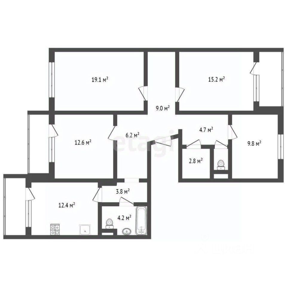 Все комнаты раздельные и имеют оптимальные размеры: 12.6, 19.1, 15.2 и 9.8 кв.м., что обеспечивает максимальный комфорт и возможность для личного пространства. Просторный коридор создает ощущение свободы и легкости. Квартира выполнена в стиле ''распашонка'', что позволяет наслаждаться солнечными днями благодаря окнам, выходящим на две стороны: во двор и на улицу.
