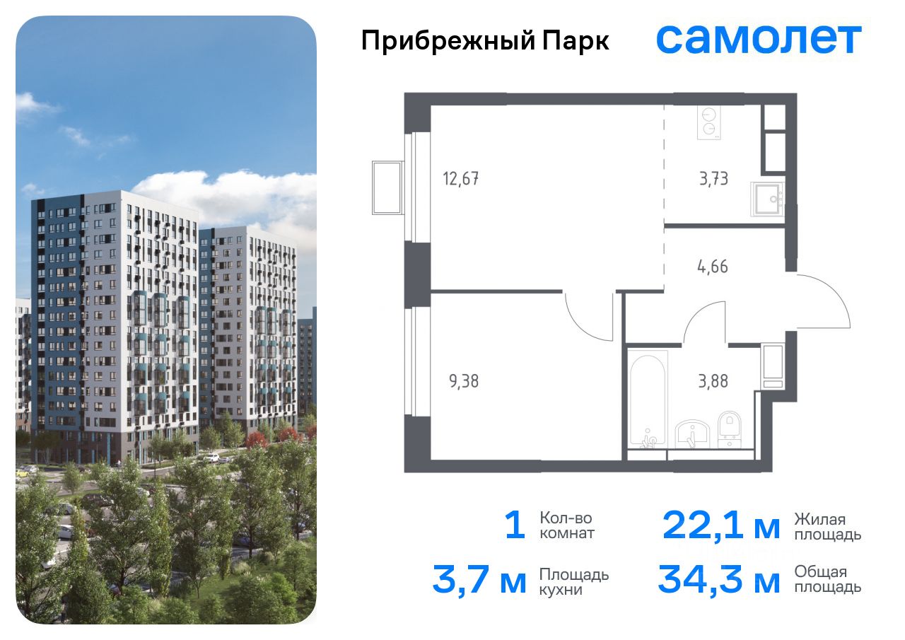 Предлагается 1-комнатная квартира комфорт-класса 34,32 кв.м в корпусе 9.2 на 3 этаже, в ЖК ''Прибрежный Парк'' Квартира с предчистовой отделкой. Доступность дополнительных опций уточняйте у застройщика.