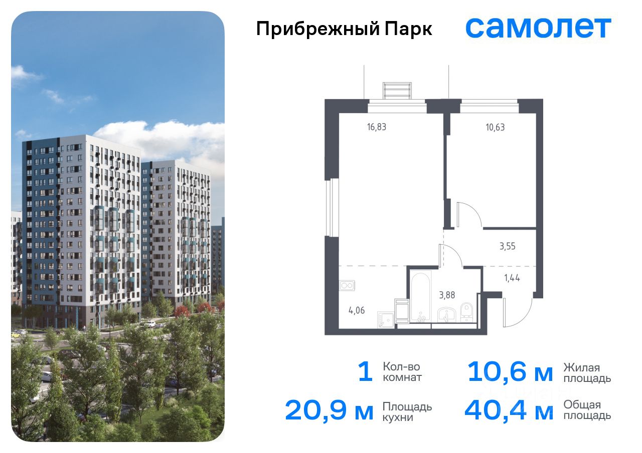 Предлагается 1-комнатная квартира комфорт-класса 39,9 кв.м в корпусе 9.1 на 5 этаже, в ЖК ''Прибрежный Парк'' Квартира с чистовой отделкой. Доступность дополнительных опций уточняйте у застройщика.