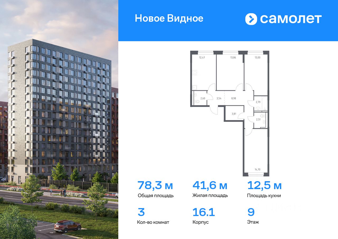 Предлагается 3-комнатная квартира комфорт-класса 78,26 кв.м в корпусе 16.1 на 9 этаже, в ЖК ''Новое Видное'' Квартира с чистовой отделкой. Доступность дополнительных опций уточняйте у застройщика.