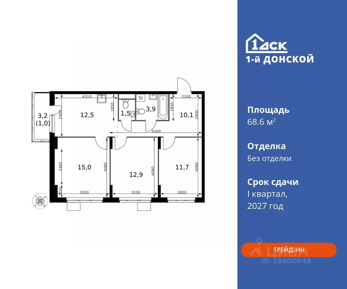 Максимальные скидки при 100% оплате. Trade-in вместо первоначального взноса - выгодно обменяйте вашу квартиру на новую! Прямая продажа от застройщика! Жилой Комплекс класса Комфорт плюс. Продаётся 3-к квартира номер 448 общей площадью 68.6 кв.м на 18-м этаже 24 этажного дома. Без отделки.