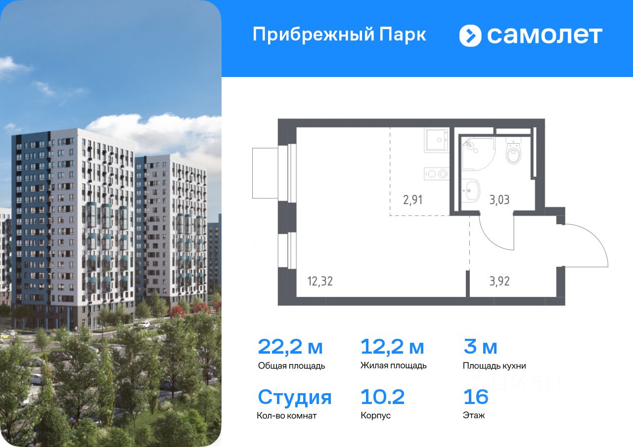 Предлагается квартира студия комфорт-класса 22,18 кв.м в корпусе 10.2 на 16 этаже, в ЖК ''Прибрежный Парк'' Квартира без отделки. Доступность опции ''отделка'' и возможность комплектации мебелью и декором уточняйте у застройщика.