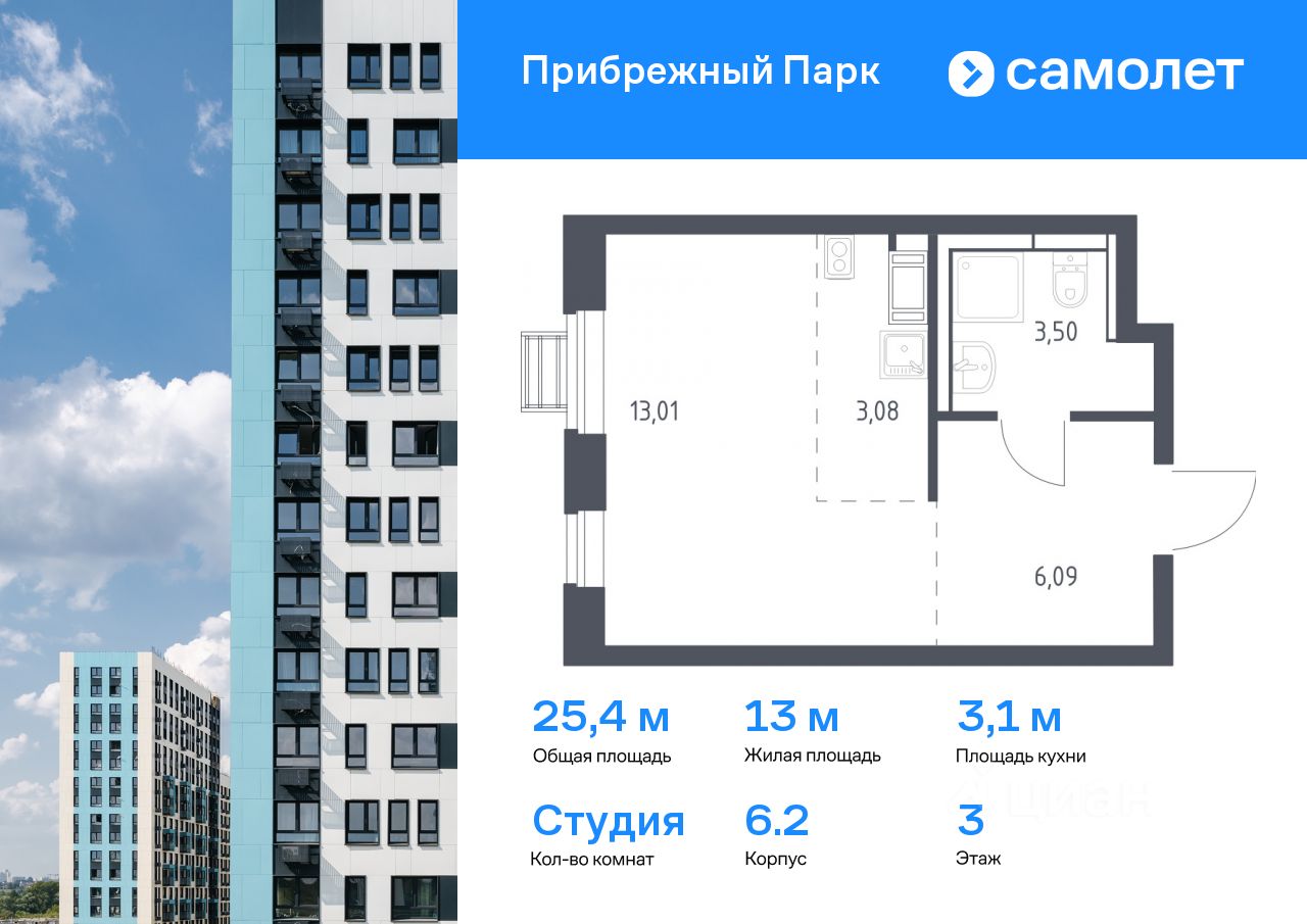 Предлагается квартира студия комфорт-класса 25,4 кв.м в корпусе 6.2 на 3 этаже, в ЖК ''Прибрежный Парк'' Квартира с чистовой отделкой. Доступность дополнительных опций уточняйте у застройщика.