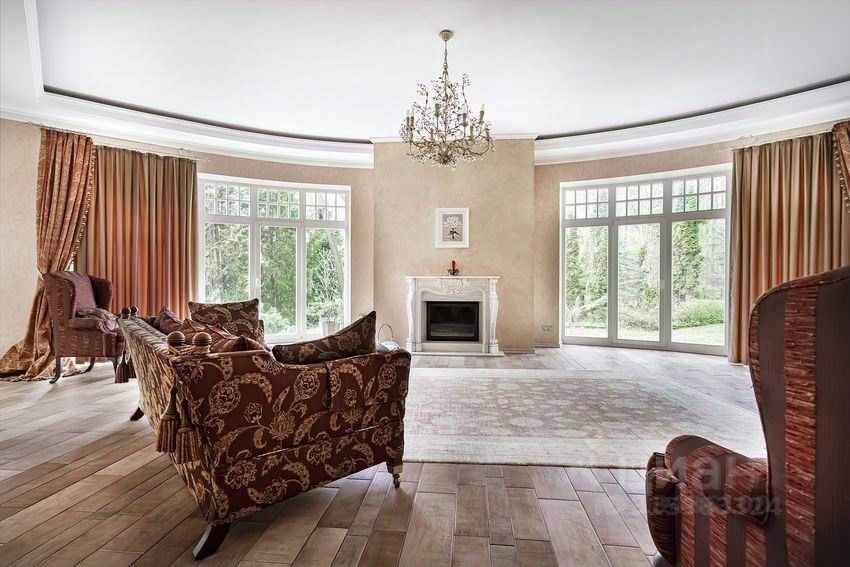 1 этаж - гардеробная, холл, гостиная с камином, кухня с выходом на веранду, 2 спальни, блок для персонала с отдельным входом,