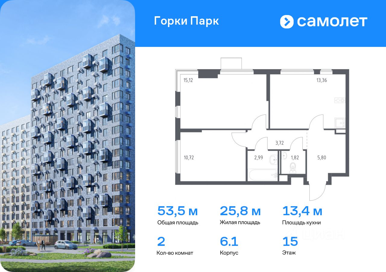 Предлагается 2-комнатная квартира комфорт-класса 53,53 кв.м в корпусе 6.1 на 15 этаже, в ЖК ''Горки Парк'' Квартира без отделки. Доступность опции ''отделка'' и возможность комплектации мебелью и декором уточняйте у застройщика.