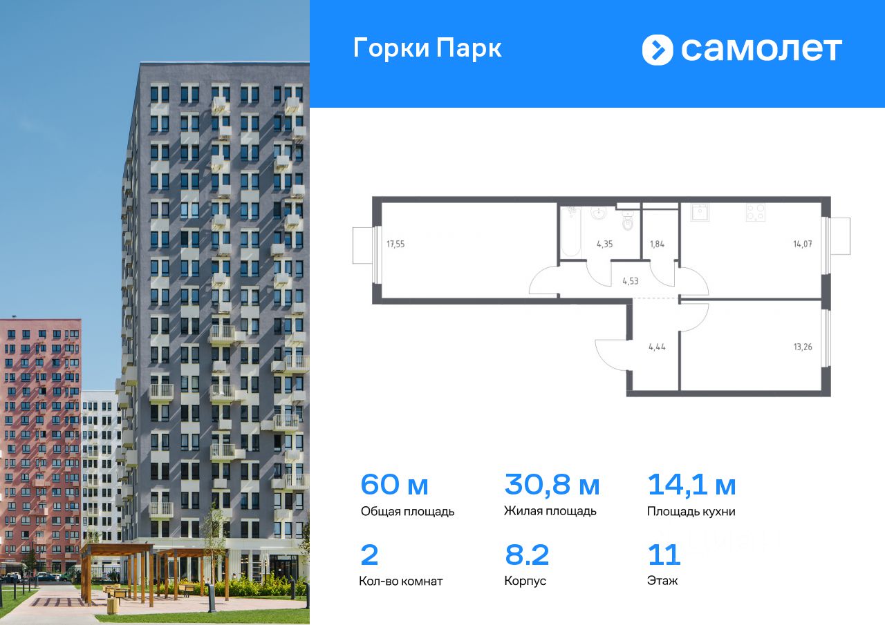 Предлагается 2-комнатная квартира комфорт-класса 60,04 кв.м в корпусе 8.2 на 11 этаже, в ЖК ''Горки Парк'' Квартира с предчистовой отделкой. Доступность дополнительных опций уточняйте у застройщика.