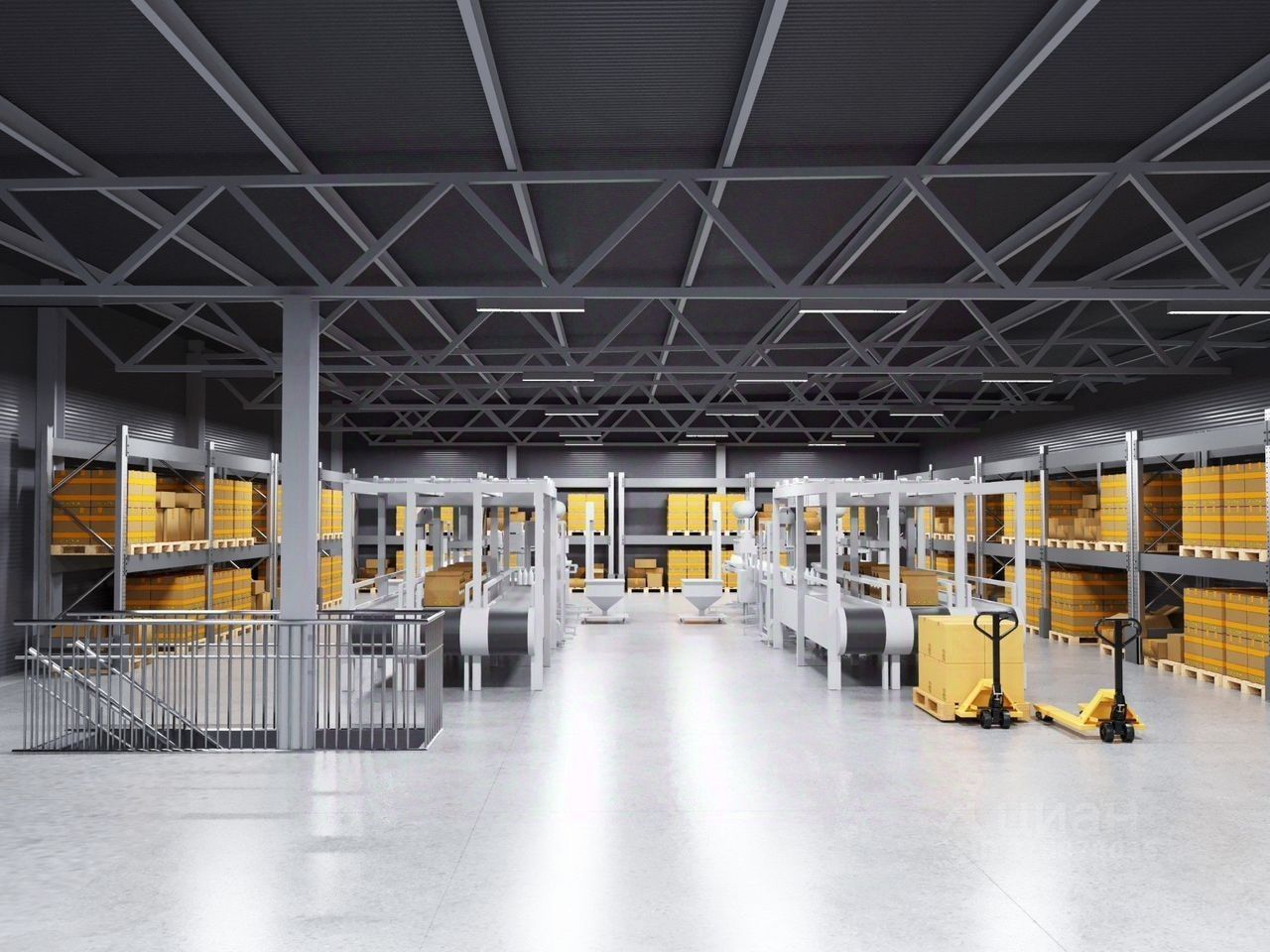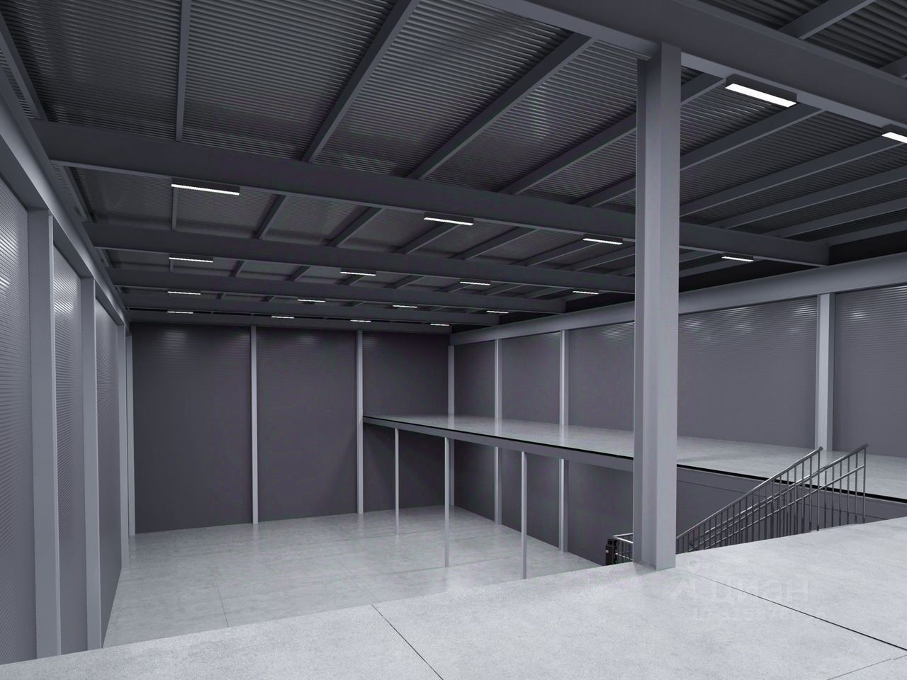 Шаг колонн, м - 34*34 м, без вертикальных связей Зона разгрузки - разгрузка на уровне -1,1 метра от уровня пола Нагрузка на пол с антипылевым покрытием - 6 т/м2 по функционалу как у склада А Нагрузка на полы мезонина на высоте 5,6 метров - от 500 до 1500 кг/м² Напольное размещение грузов на мезонине - от 5,6 метров Размещение грузов на стеллажах от пола - до 5 уровней