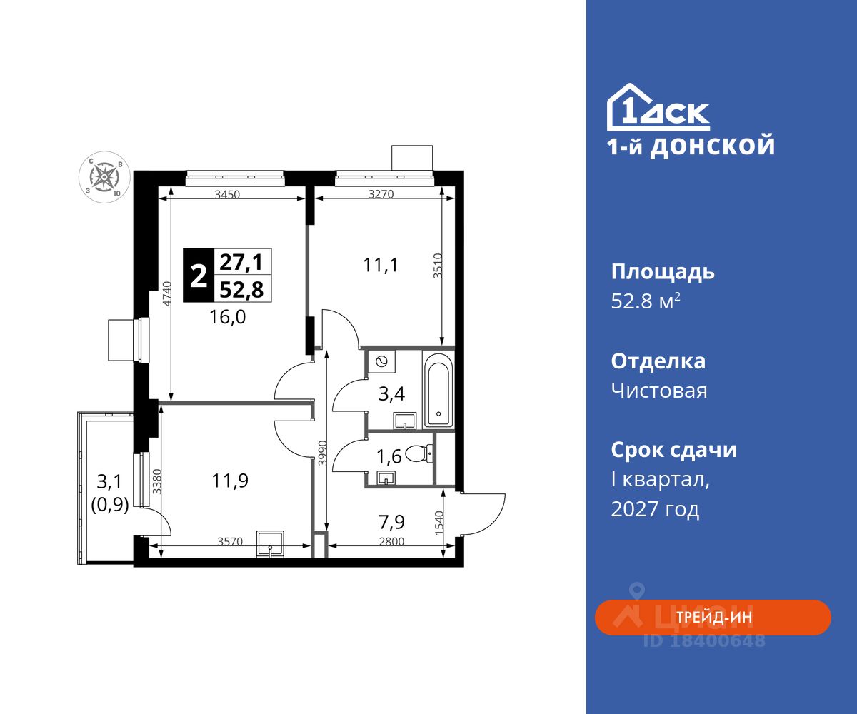 Общая площадь52,8 м2