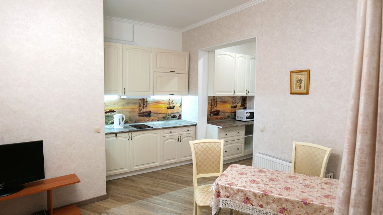 Вашему вниманию предлагается 2-х комнатная квартира в ЖК Римский. В гостинной: комфортный диван-раскладушка на два спальных места, удобный обеденный стол и тумба под телевизор, угловая секционная стойка для вещей, граничащая со шкафами в прихожей. На кухонной зоне: гарнитур с большой столешницей, имеется много места для хранения. Из бытовых приборов кухонной зоны: электрический чайник, электрическая панель на 2 секции, вытяжка, микроволновая печь и холодильник. Ванная комната представляет собой помещение совмещенное с сан.узлом. (сидячая ванна). Вторая комната: спальня с широкой кроватью, напротив которой расположен гарнитур с закрытыми шкафами. В глубине спальни находится удобная гардеробная комната с установленной системой хранения.