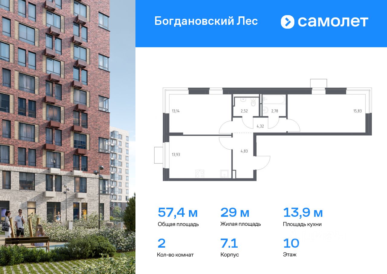 Предлагается 2-комнатная квартира комфорт-класса 57,35 кв.м в корпусе 7.1 на 10 этаже, в ЖК ''Богдановский Лес'' Квартира без отделки. Доступность опции ''отделка'' и возможность комплектации мебелью и декором уточняйте у застройщика.