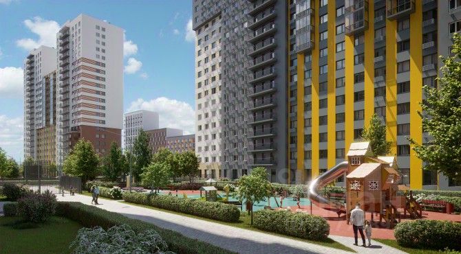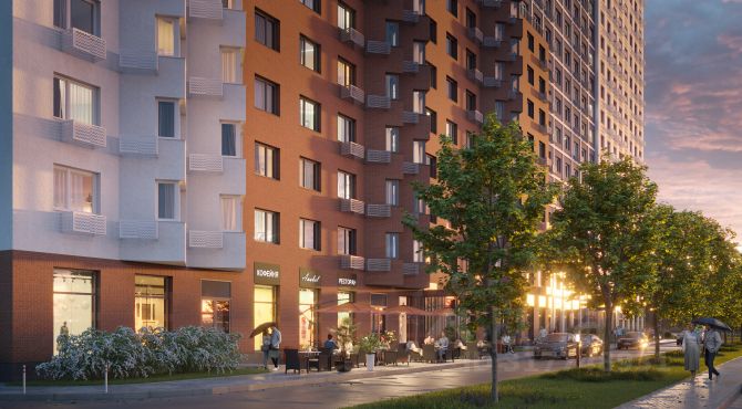Многоэтажные дома, с открытыми внутренними дворами вписаны в общую зеленую зону и объединены с существующим ландшафтным окружением в единый природный комплекс. Пластика разноэтажной застройки (от пятнадцати до двадцати пяти этажей), с включением объемных разноуровневых элементов, создает ощущение плавного контура городской застройки и подчинена созданию образа многообразной и масштабной городской архитектуры.