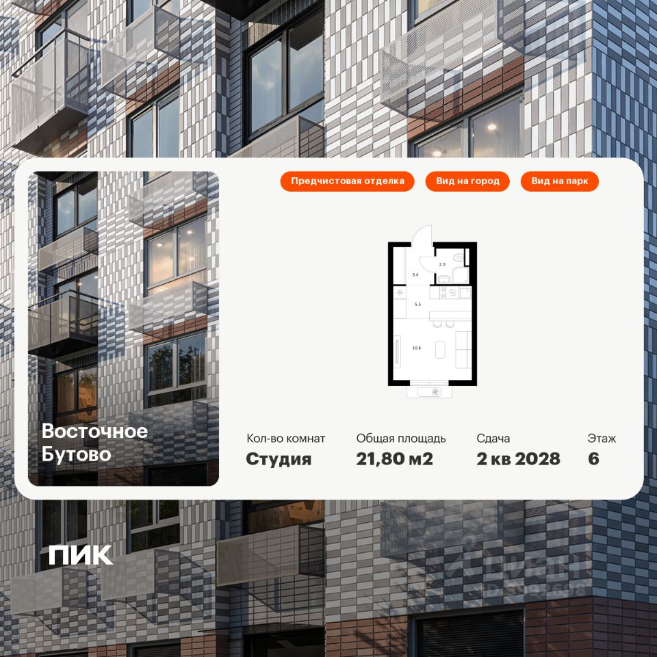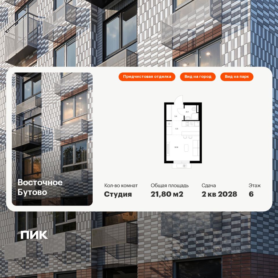 Продаётся квартира-студия площадью 21,8 кв.м на 6 этаже 25 этажного дома (Корпус 47, Секция 3) проекта ПИК Восточное Бутово. Светлый просторный подъезд на уровне земли, функциональная планировка, большие окна, предчистовая отделка.