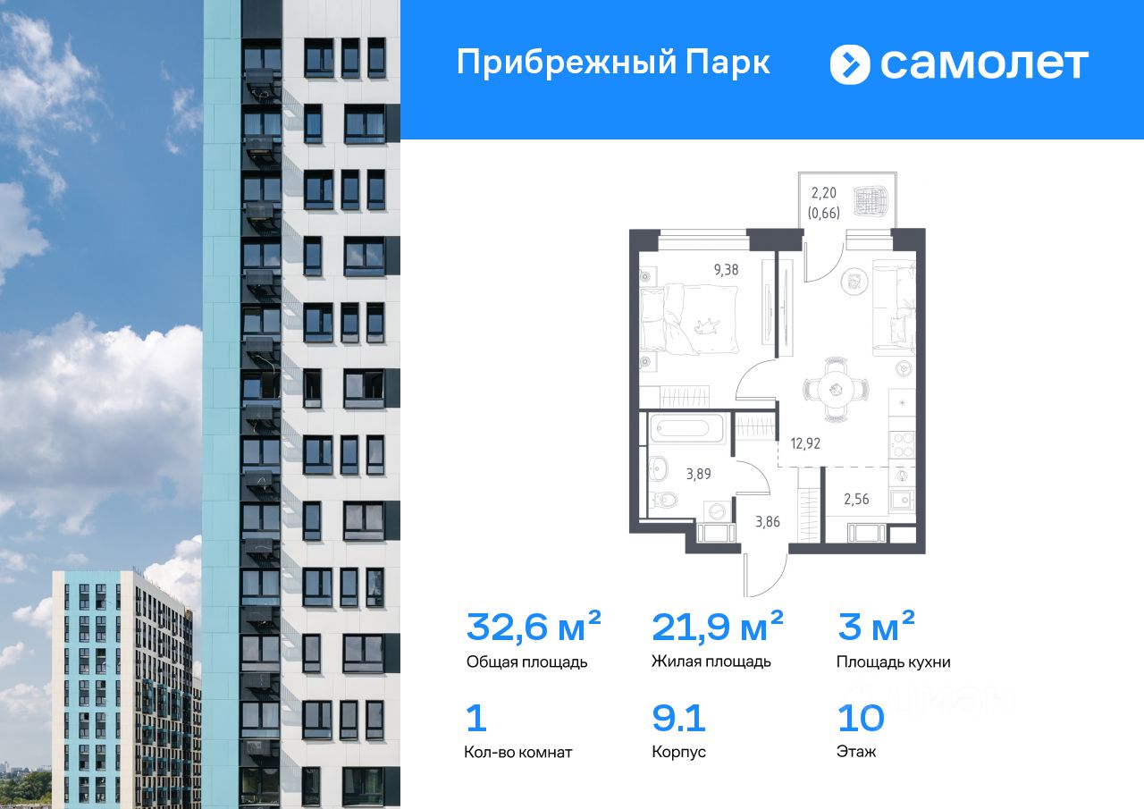 Предлагается 1-комнатная квартира комфорт-класса 32,6 кв.м в корпусе 9.1 на 10 этаже, в ЖК ''Прибрежный Парк'' Квартира с чистовой отделкой. Доступность дополнительных опций уточняйте у застройщика.