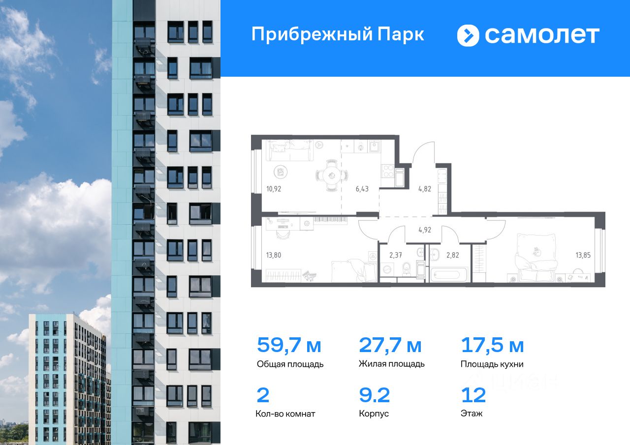 Предлагается 2-комнатная квартира комфорт-класса 59,7 кв.м в корпусе 9.2 на 12 этаже, в ЖК ''Прибрежный Парк'' Квартира с предчистовой отделкой. Доступность дополнительных опций уточняйте у застройщика.