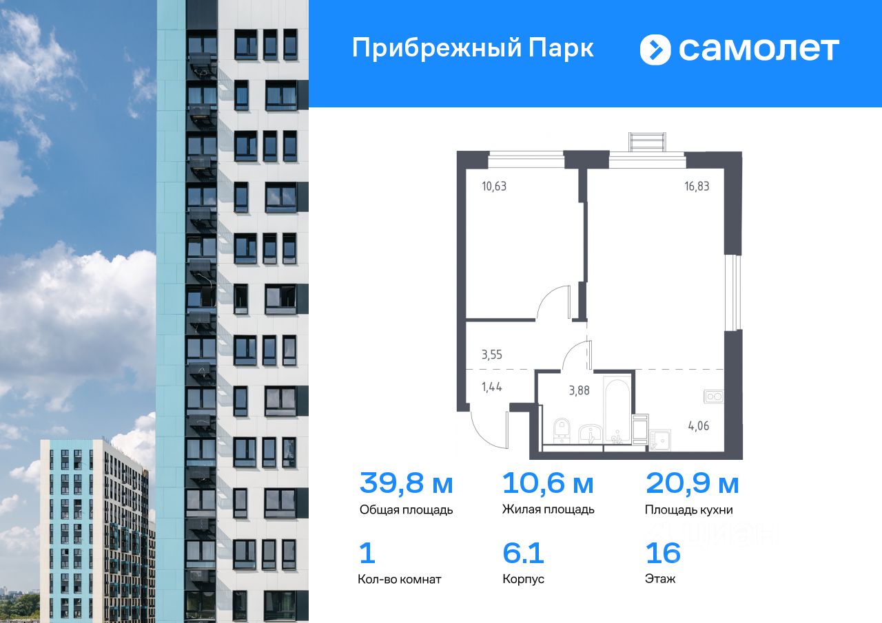 Предлагается 1-комнатная квартира комфорт-класса 39,8 кв.м в корпусе 6.1 на 16 этаже, в ЖК ''Прибрежный Парк'' Квартира с чистовой отделкой. Доступность дополнительных опций уточняйте у застройщика.