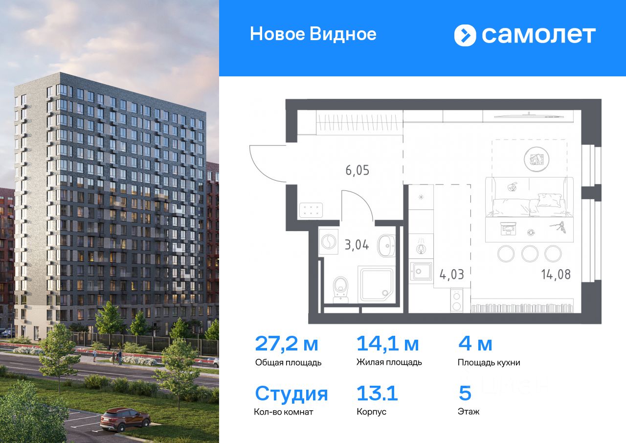 Предлагается квартира студия комфорт-класса 27,2 кв.м в корпусе 13.1 на 5 этаже, в ЖК ''Новое Видное'' Квартира с предчистовой отделкой. Доступность дополнительных опций уточняйте у застройщика.