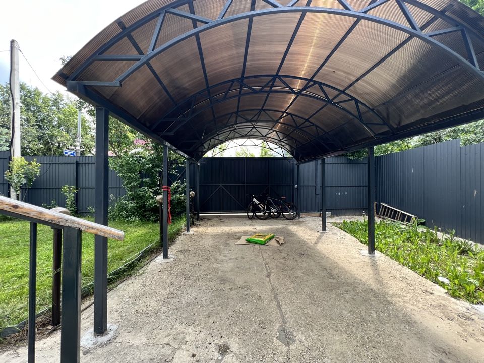 Участок ровной прямоугольной формы. На нем расположены: телица, плодовые деревья, растут цветы, ухоженная территория, установлен большой навес для авто.