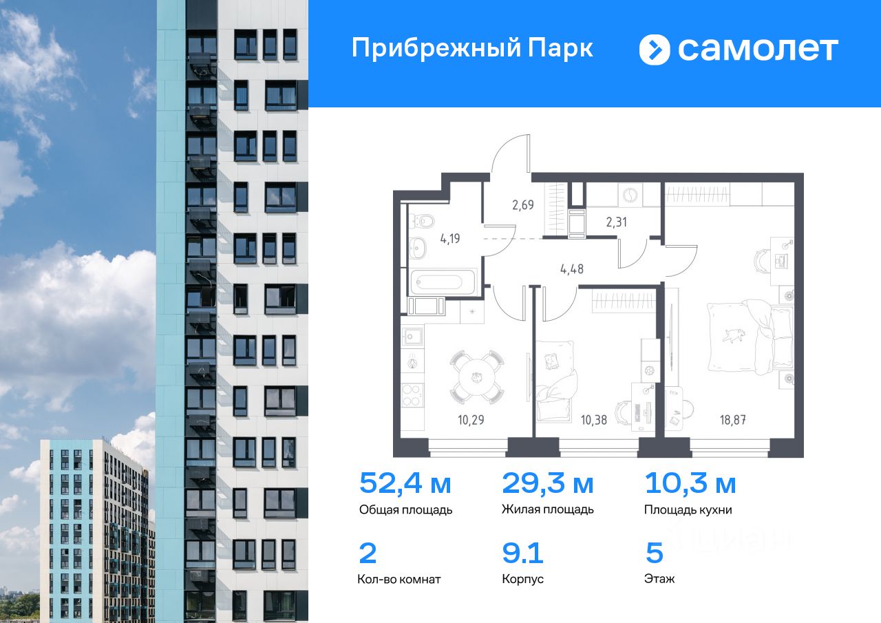 Предлагается 2-комнатная квартира комфорт-класса 52,4 кв.м в корпусе 9.1 на 5 этаже, в ЖК ''Прибрежный Парк'' Квартира с чистовой отделкой. Доступность дополнительных опций уточняйте у застройщика.