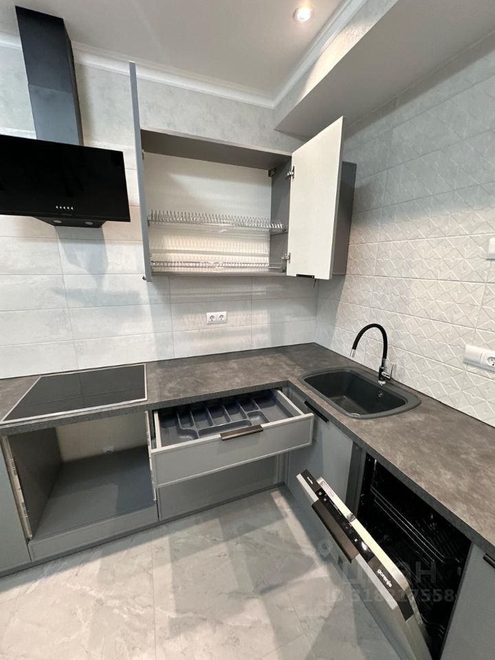 Кухонный гарнитур фабрики Зов, встроена качественная техника: электрическая плита и посудомоечная машина Gоrеnyе, вытяжка Кrоnа, установлена керамическая мойка с удобным смесителем с гибким шлангом, также остается раздвижной обеденный стол и стулья с мягкой велюровой обивкой.