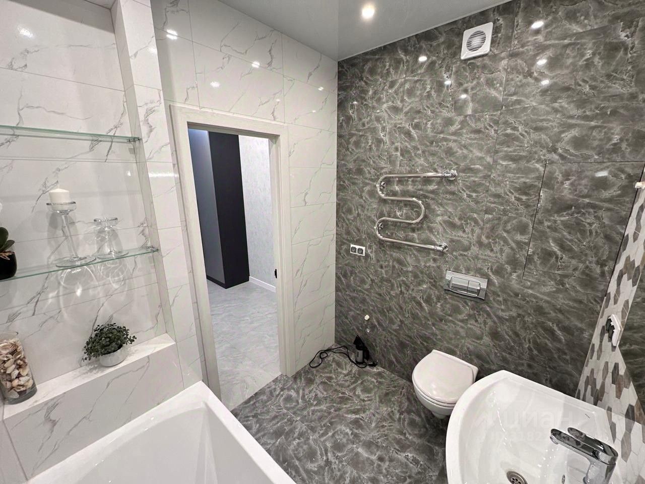 Отделка в с/у установлена испанская инсталляция фирмы рока, зеркало с подсветкой.