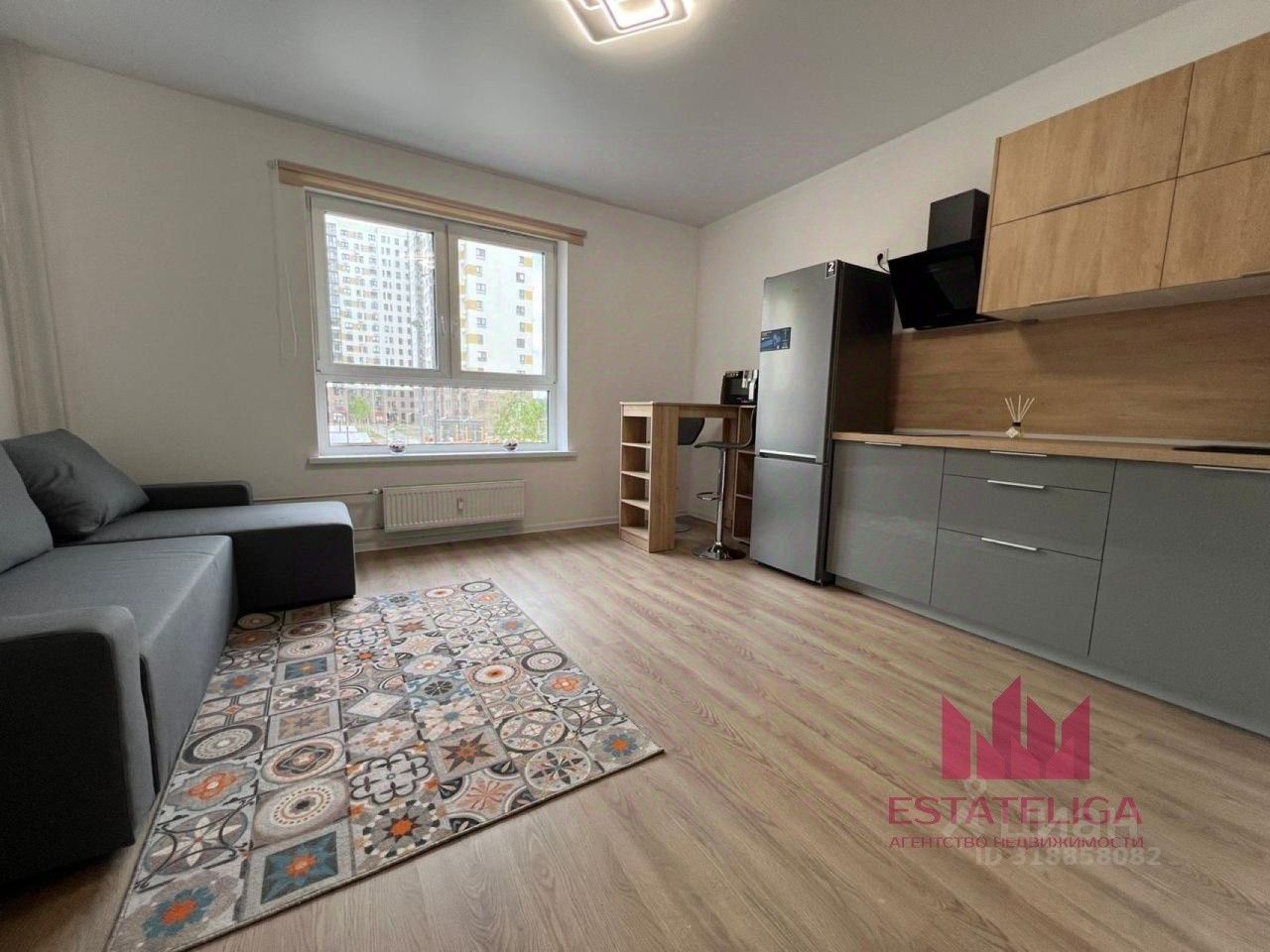 В квартире присутствует вся необходимая для жизни мебель, а также техника. В комнате расположена большой раскладной диван-кровать, рабочая зона с телевизором, барная стойка и стулья и стулья. На кухне имеется гарнитур, электрический чайник, холодильник, микроволновая печь, а также электрическая варочная панель. Имеется удобная гардеробная.