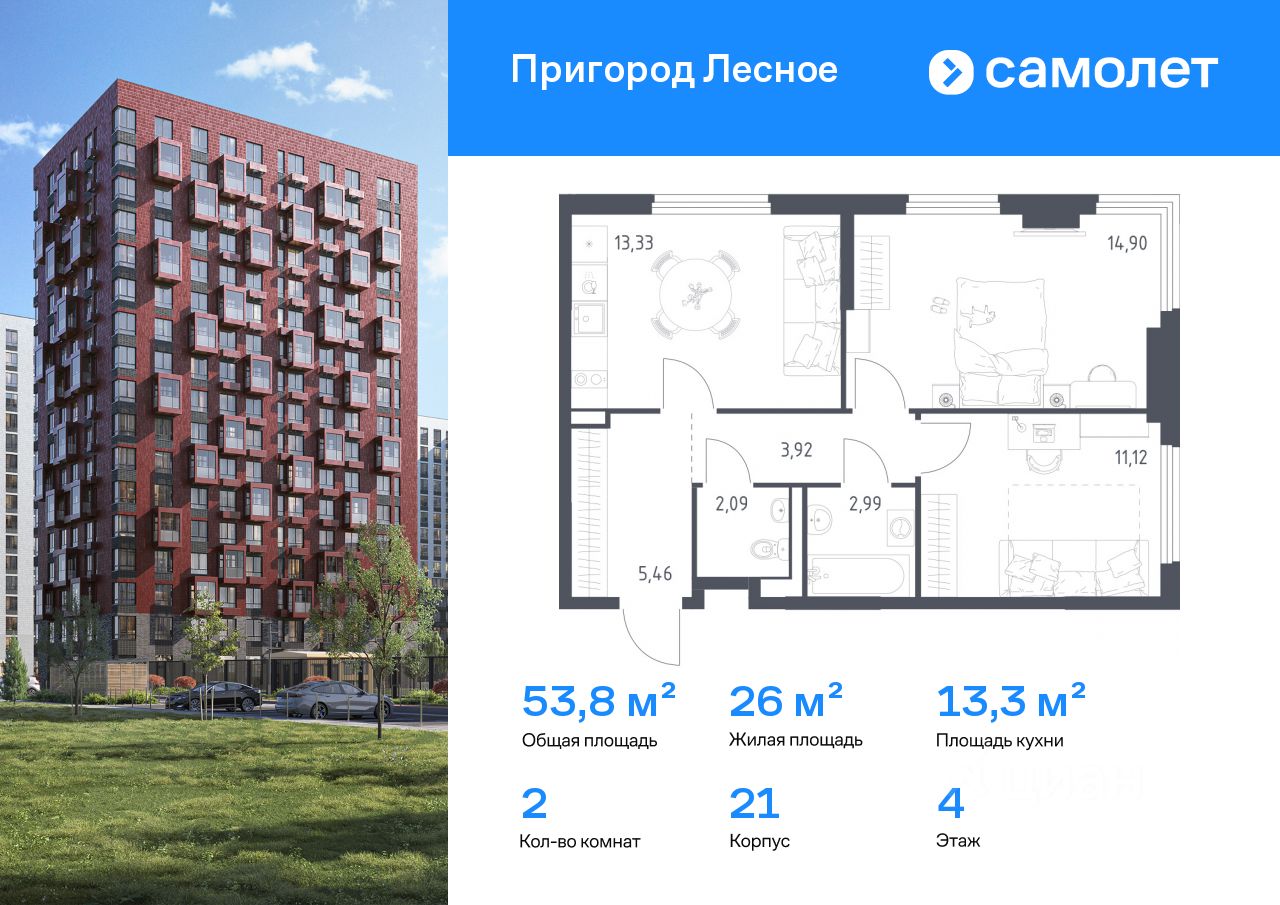 Предлагается 2-комнатная квартира комфорт-класса 53,81 кв.м в корпусе 21 на 4 этаже, в ЖК ''Пригород Лесное'' Квартира без отделки. Доступность опции ''отделка'' и возможность комплектации мебелью и декором уточняйте у застройщика.