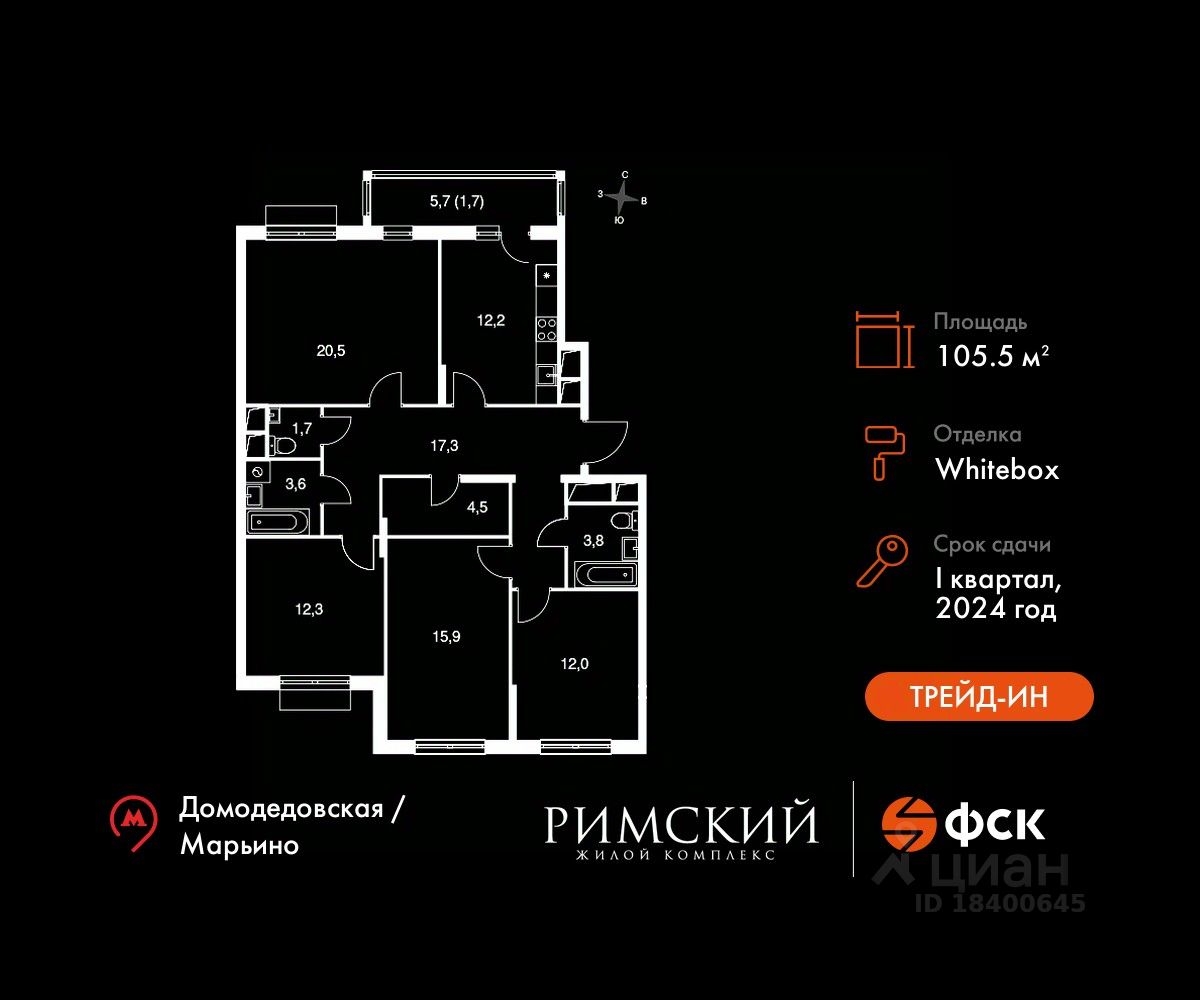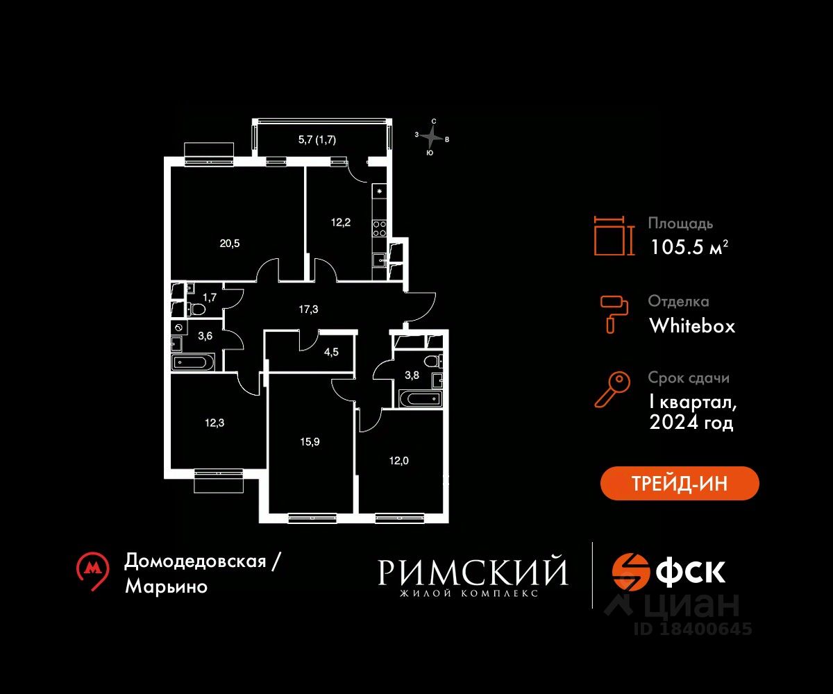 Особенности: - Квартира доступна к покупке в Trade-In. - Просторная спальня, в которой можно разместить большую кровать. - Распашная планировка - отличное сочетание удобства и свободы. - Раздельный санузел - Гостевой санузел - комфорт и удобство для ваших гостей. - Рабочий кабинет - место для работы и сосредоточения. - Можно оборудовать 2 или более рабочих места - пространство для нескольких человек. - Место для игры/занятия спортом - идеальное пространство для активных детей.