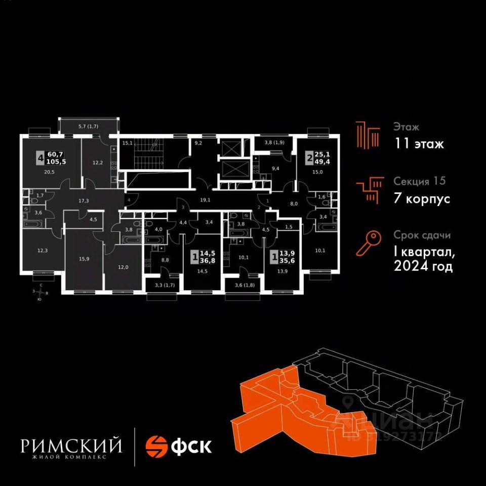 Максимальные скидки при 100% оплате. Готовый дом! Прямая продажа от застройщика! Жилой Комплекс класса Комфорт. Продаётся 4-к квартира номер 1099 в сданном корпусе общей площадью 105.5 кв.м на 11-м этаже 16 этажного дома.