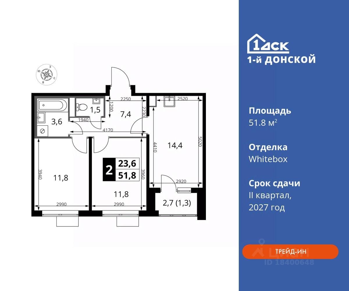 Максимальные скидки при 100% оплате. Trade-in вместо первоначального взноса - выгодно обменяйте вашу квартиру на новую! Прямая продажа от застройщика! Жилой Комплекс класса Комфорт плюс. Продаётся 2-к квартира номер 122 общей площадью 51.8 кв.м на 13-м этаже 24 этажного дома. Отделка Whitebox.