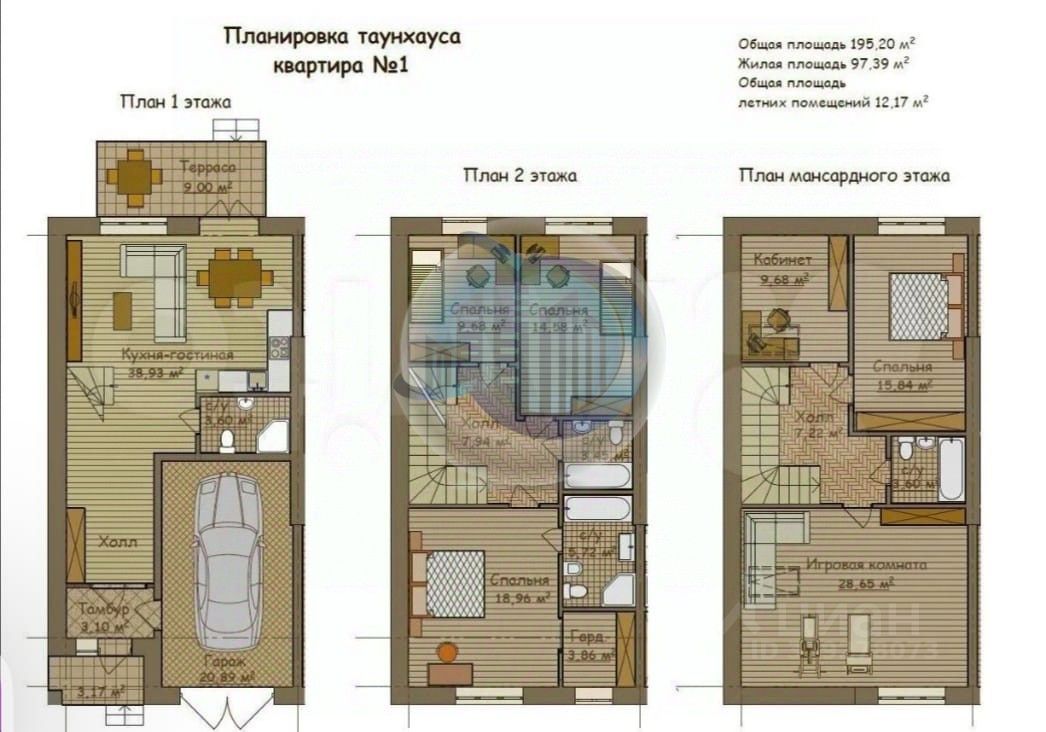 Это таунхаус общей площадью 195 м². Каркас здания выполнен из железобетона, а перекрытия — монолитные. Стены из кирпича, крыша — из металлочерепицы. Под каждой секцией находится отдельный земельный участок, на который и на дом предоставляется право собственности. Уже присвоен адрес. Все коммуникации подведены к участку.