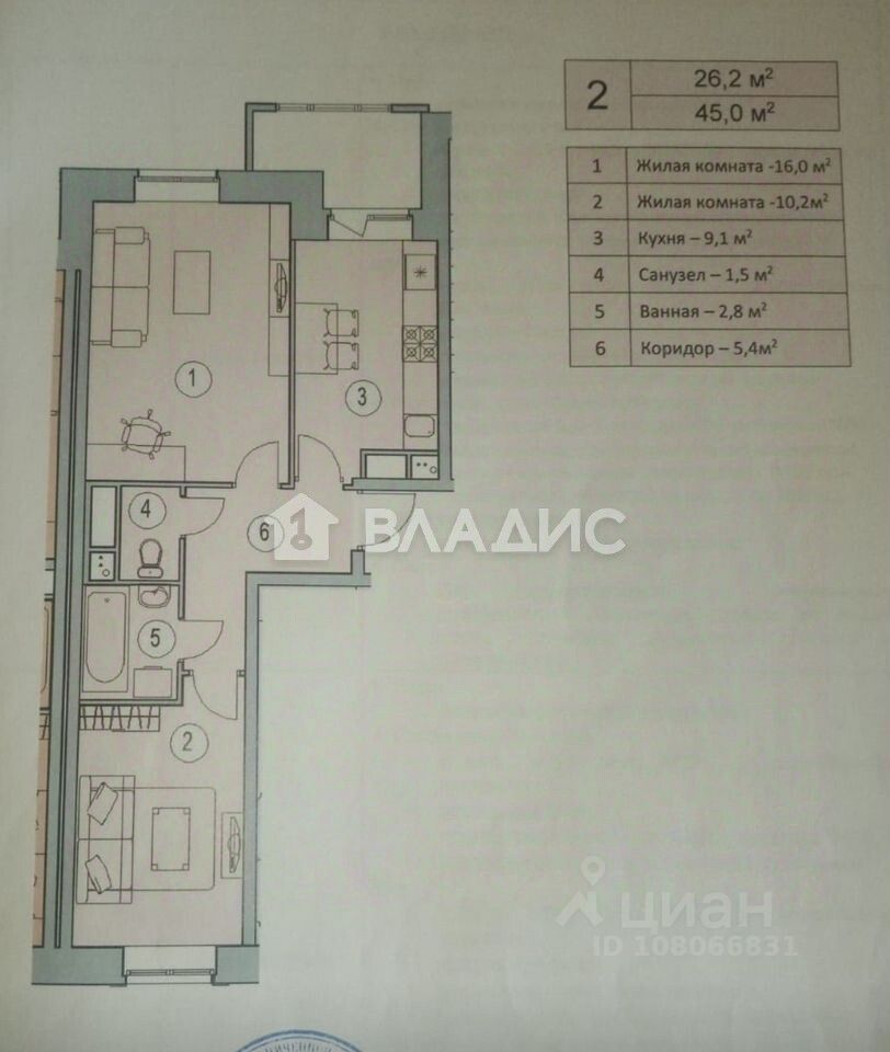 Общая площадь квартиры составляет 45,6 кв. м, из которых 26,2 кв. м — жилая площадь. Две комнаты (16 и 10,2 кв. м) идеально подойдут для разных целей: например, гостиной и спальни. Кухня площадью 9,1 кв. м станет местом для воплощения кулинарных фантазий.