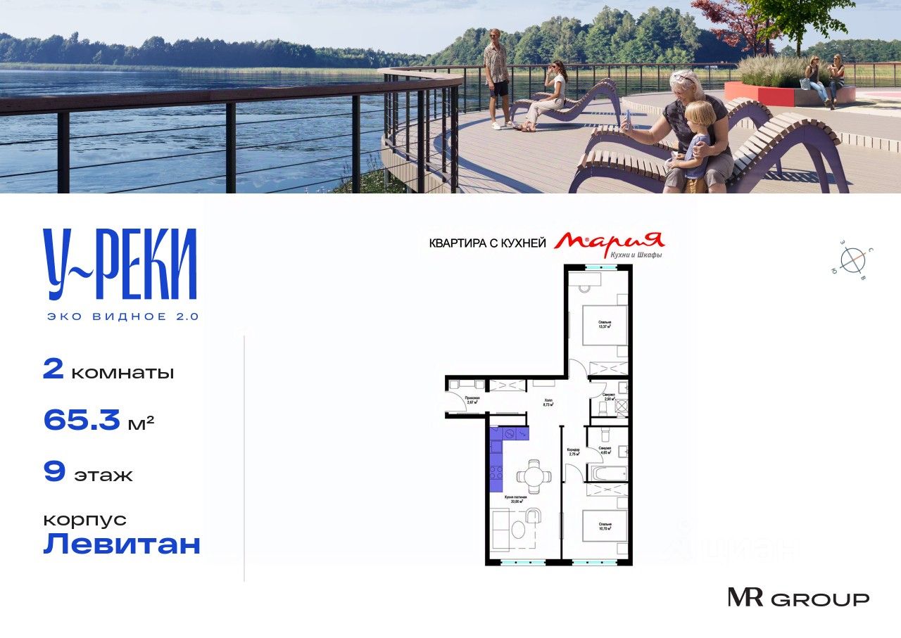 Прямая продажа от застройщика. Продаётся 2-к квартира общей площадью 65.30 кв. м с чистовой отделкой в ЖК ''У реки. Эко Видное 2.0'' на 9-м этаже 17 этажного корпуса Левитан. Все корпуса введены в эксплуатацию. Выдача ключей - II кв. 2025г. Семнадцатиэтажный корпус ''Левитан'' состоит из 13 секций, образующих в плане закрытый периметр двора. Эко-повестка и комфорт — это формат осознанной жизни, разработанный ''Бюро А4'' для благоустройства корпуса ''Левитан''. В проекте развиваются две темы: образ реки и настроения пейзажей Левитана которые раскрываются через четыре функциональные зоны.