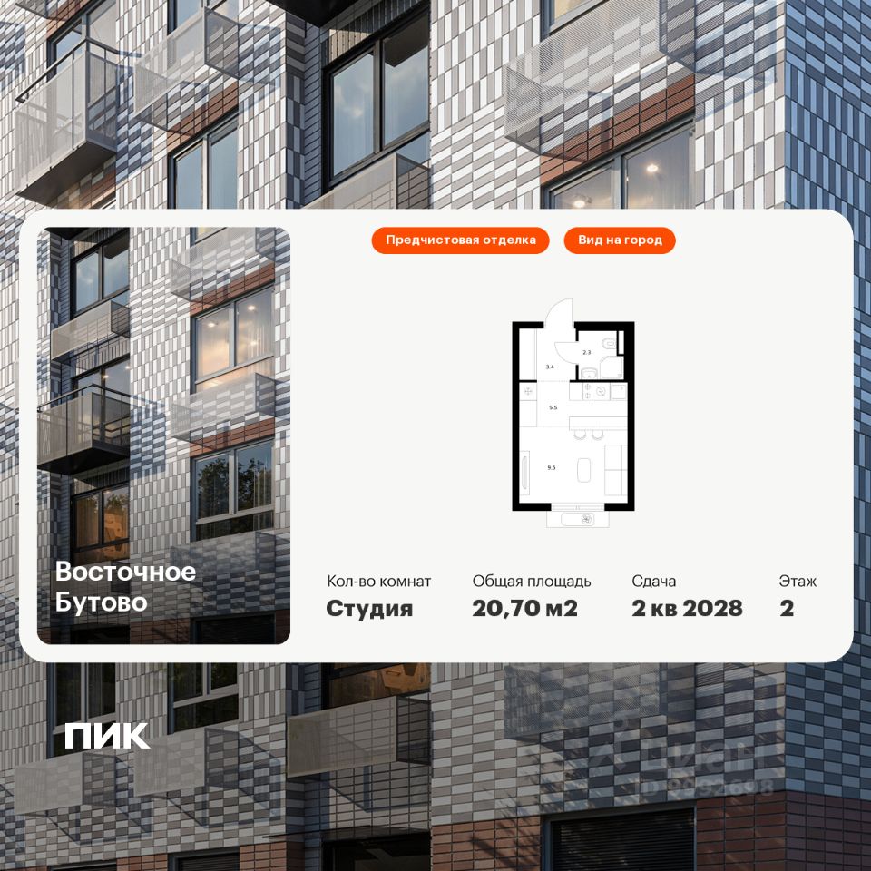 Продаётся квартира-студия площадью 20,7 кв.м на 2 этаже 25 этажного дома (Корпус 47, Секция 3) проекта ПИК Восточное Бутово. Светлый просторный подъезд на уровне земли, функциональная планировка, большие окна, предчистовая отделка.