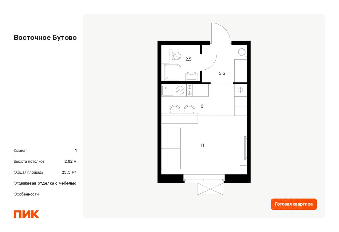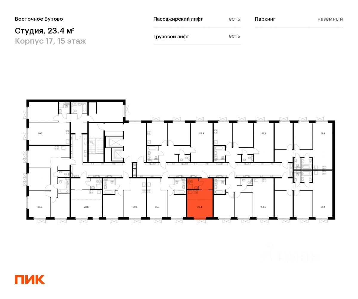 Продаётся квартира-студия площадью 23,3 кв.м на 15 этаже 16 этажного дома (Корпус 17, Секция 3) проекта ПИК Восточное Бутово. Светлый просторный подъезд на уровне земли, функциональная планировка, большие окна, c отделкой.