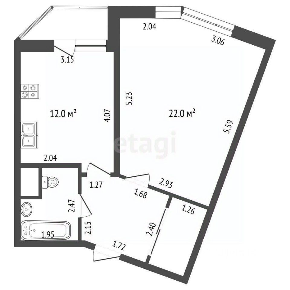 Улучшенная планировка квартиры как у евродвушки, общей площадью 48 м кв. с двумя большими комнатами: кухня - 12 м кв., жилая комната - 22 м кв. Совмещенный санузел, просторный коридор и эргономичная входная группа. Застеклённая лоджия объединена с кухней и добавляет дополнительное пространство для хранения и отдыха.