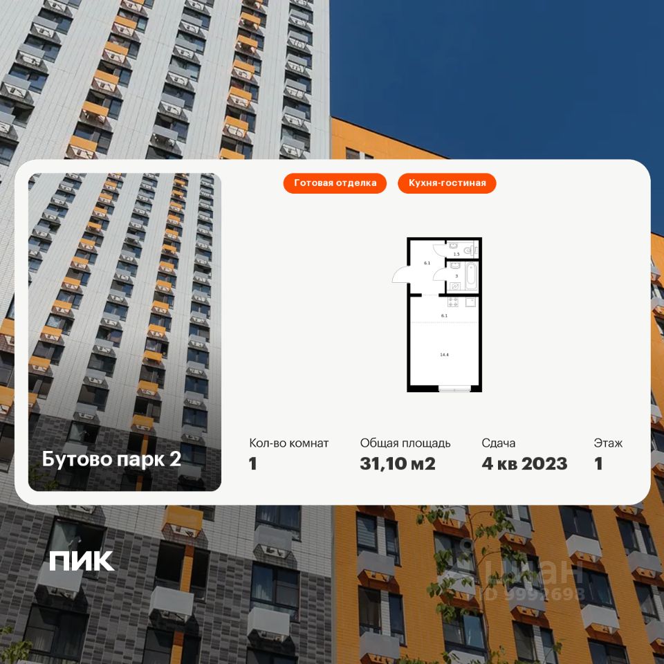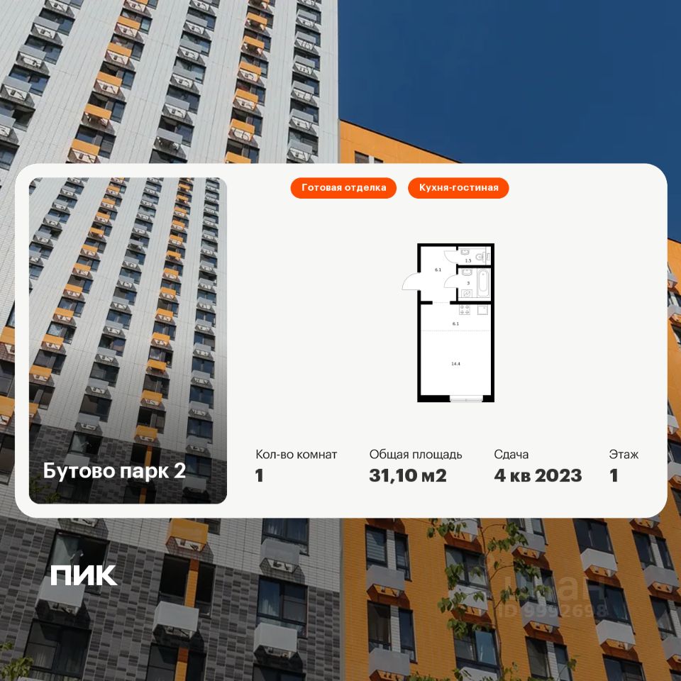 Продаётся 1-комн. квартира площадью 31,1 кв.м на 1 этаже 17 этажного дома (Корпус 9-10.4, Секция 1) проекта ПИК Бутово парк 2. Светлый просторный подъезд на уровне земли, функциональная планировка, большие окна, c отделкой.