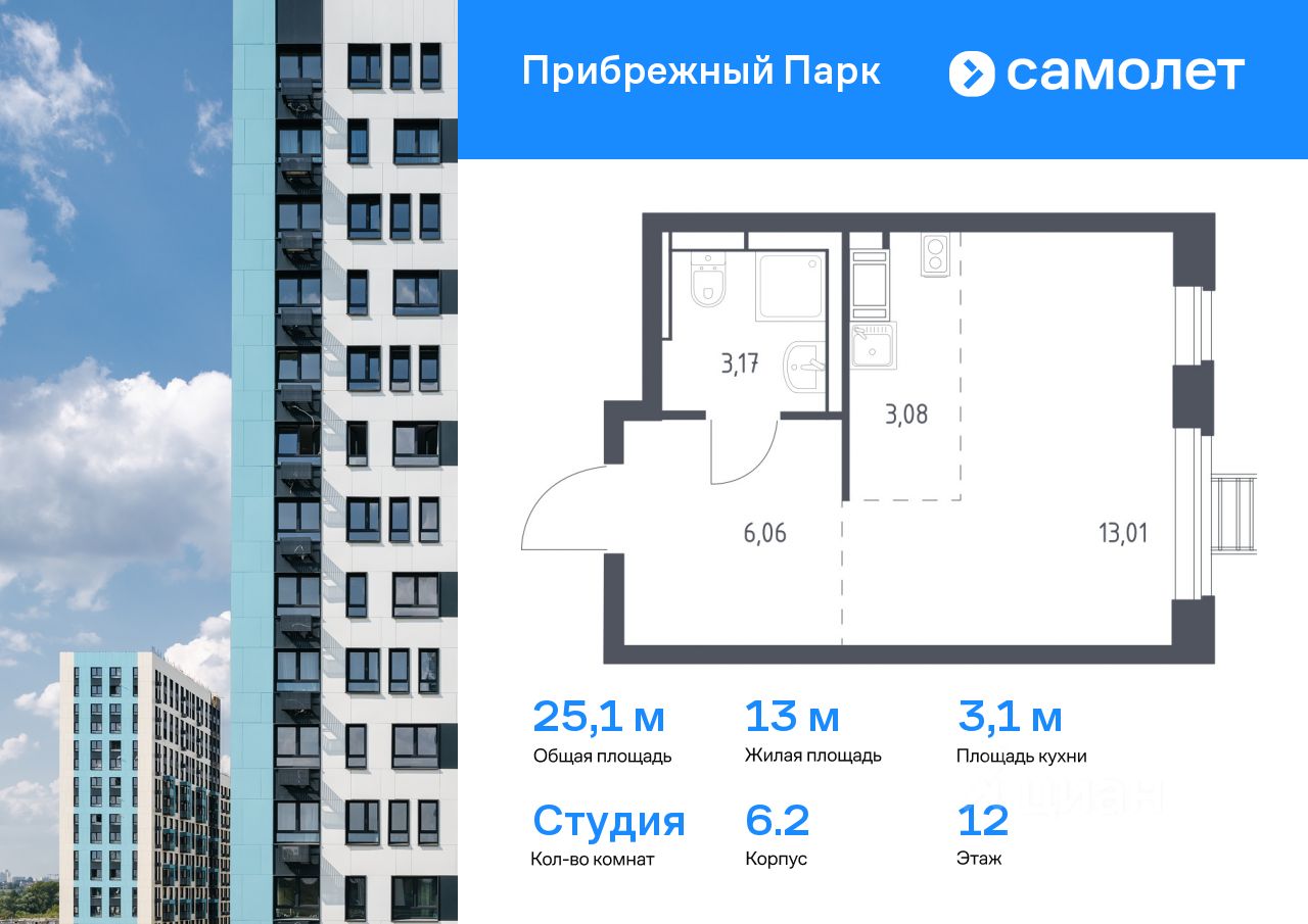 Предлагается квартира студия комфорт-класса 25,1 кв.м в корпусе 6.2 на 12 этаже, в ЖК ''Прибрежный Парк'' Квартира с чистовой отделкой. Доступность дополнительных опций уточняйте у застройщика.