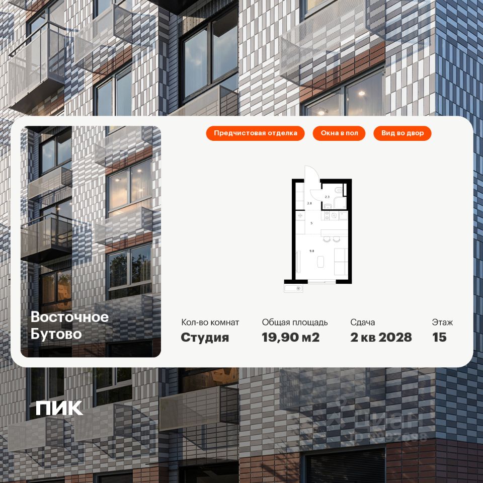 Продаётся квартира-студия площадью 19,9 кв.м на 15 этаже 17 этажного дома (Корпус 48, Секция 2) проекта ПИК Восточное Бутово. Светлый просторный подъезд на уровне земли, функциональная планировка, большие окна, предчистовая отделка.