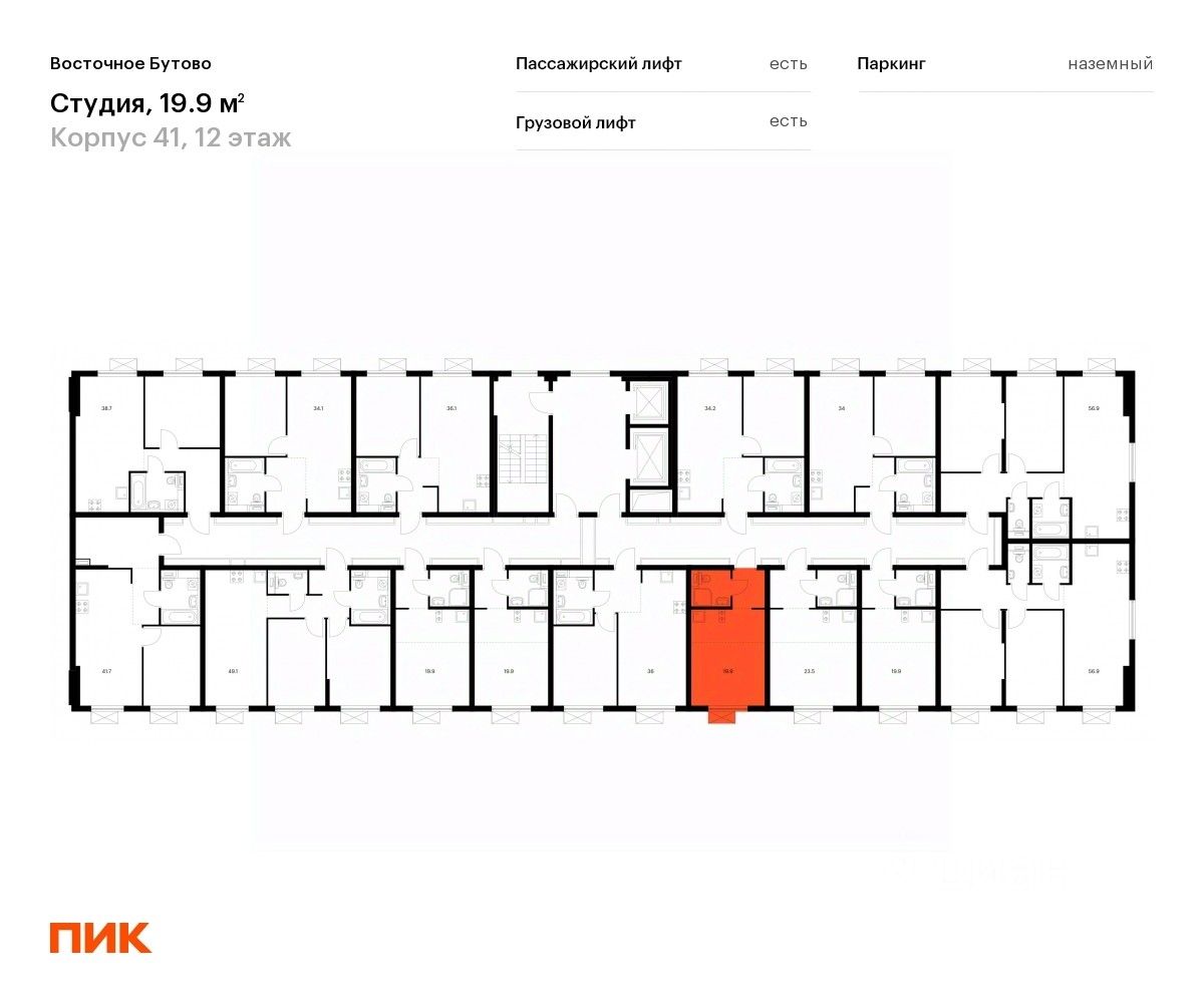 Продаётся квартира-студия площадью 19,9 кв.м на 12 этаже 16 этажного дома (Корпус 41, Секция 1) проекта ПИК Восточное Бутово. Светлый просторный подъезд на уровне земли, функциональная планировка, большие окна, c отделкой.
