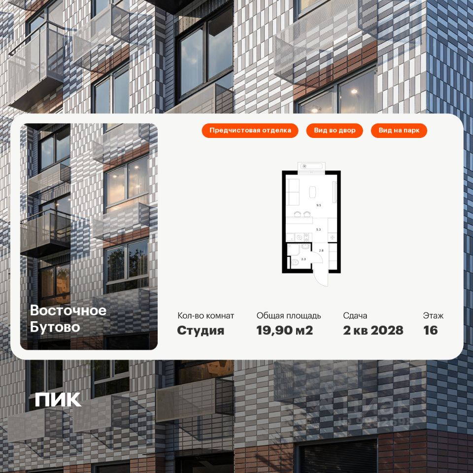 Продаётся квартира-студия площадью 19,9 кв.м на 16 этаже 17 этажного дома (Корпус 48, Секция 1) проекта ПИК Восточное Бутово. Светлый просторный подъезд на уровне земли, функциональная планировка, большие окна, предчистовая отделка.