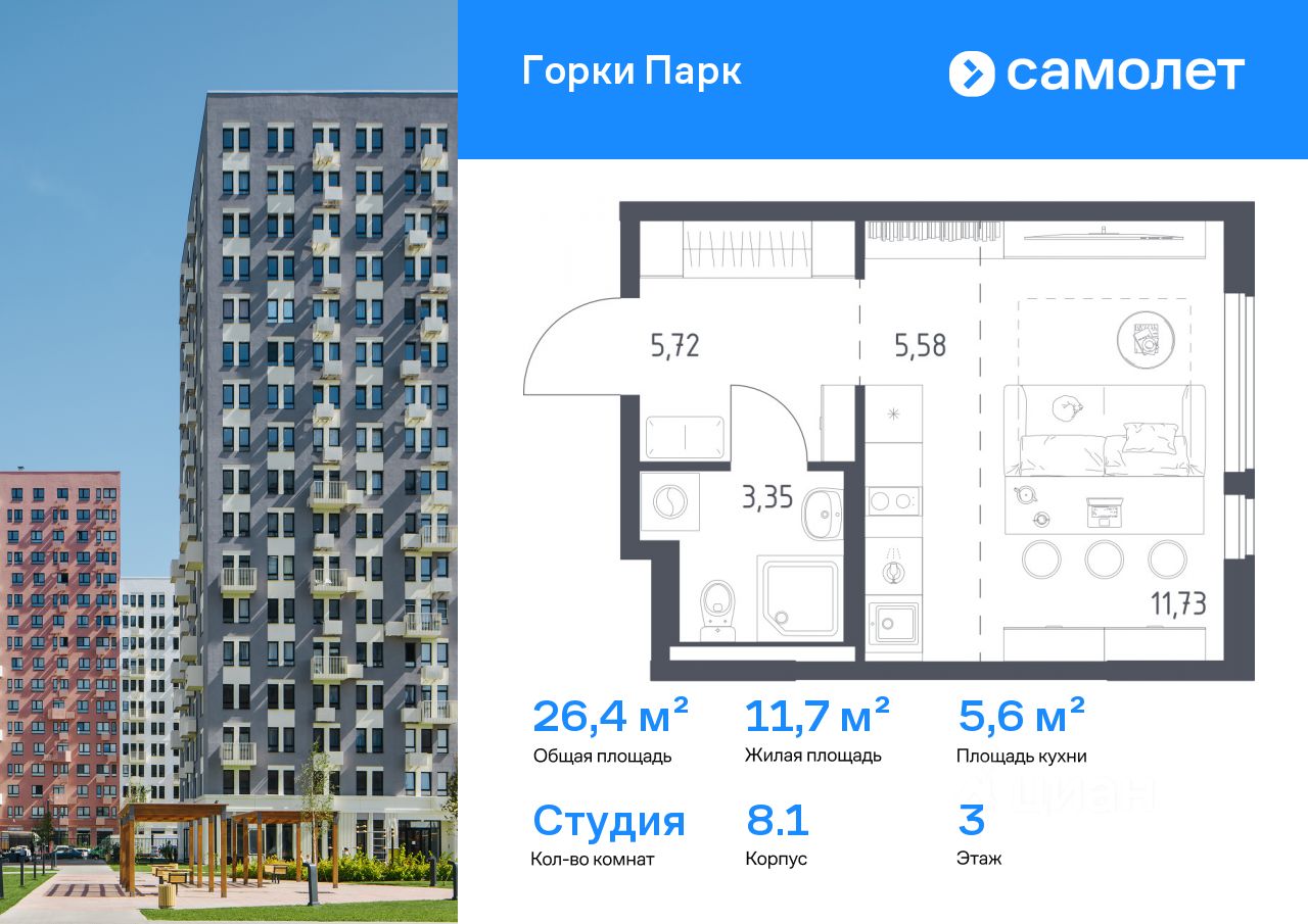 Строим кварталы для жизни с заботой о будущем. Предлагается квартира студия комфорт-класса 26,38 кв.м в корпусе 8.1 на 3 этаже, в ЖК ''Горки Парк'' Квартира без отделки. Доступность опции ''отделка'' и возможность комплектации мебелью и декором уточняйте у застройщика.