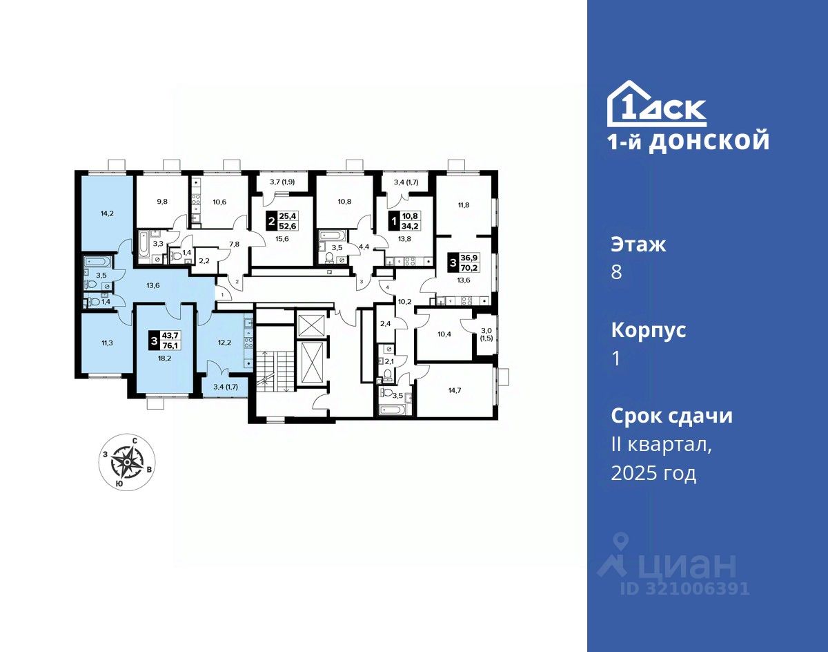 Максимальные скидки при 100% оплате. Trade-in вместо первоначального взноса - выгодно обменяйте вашу квартиру на новую! Корпус сдан! Прямая продажа от застройщика! Жилой Комплекс класса Комфорт плюс. Продаётся 3-к квартира номер 109 в сданном корпусе общей площадью 76.1 кв.м на 8-м этаже 21 этажного дома.