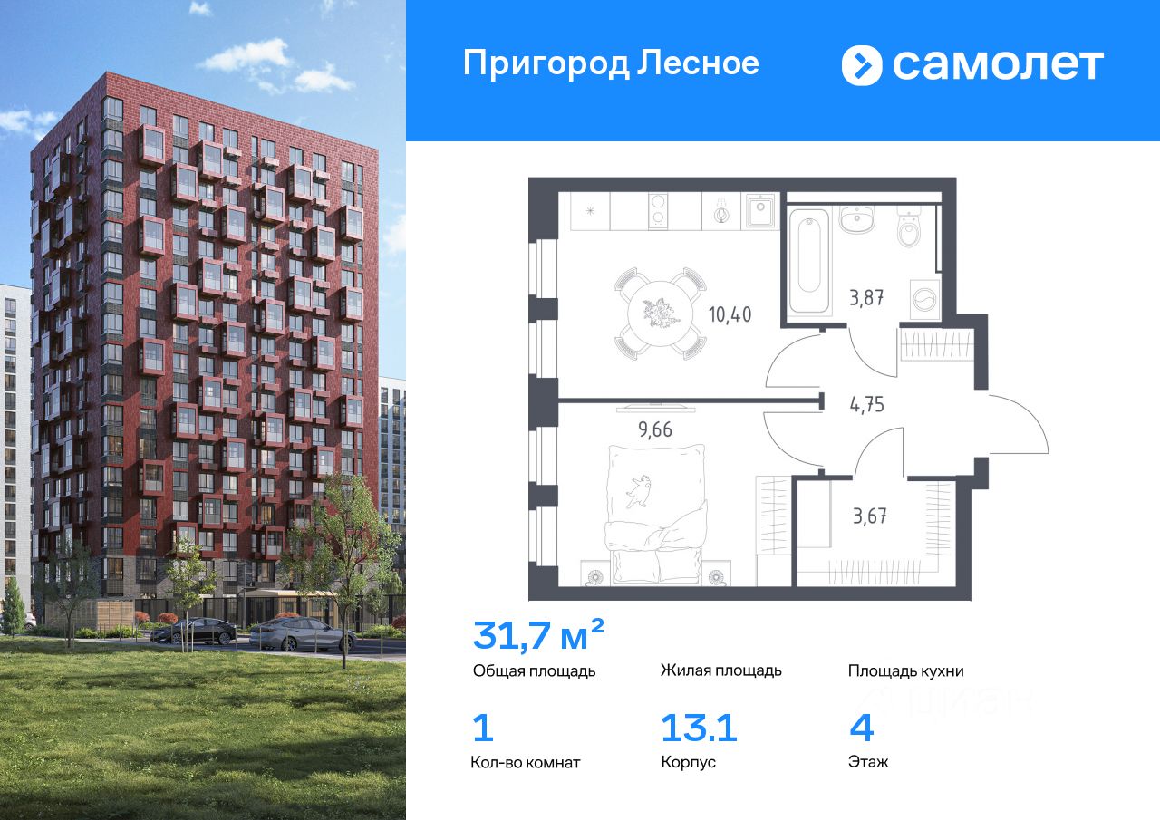 Предлагается 1-комнатная квартира комфорт-класса 31,7 кв.м в корпусе 13.1 на 4 этаже, в ЖК ''Пригород Лесное'' Квартира с чистовой отделкой. Доступность дополнительных опций уточняйте у застройщика.