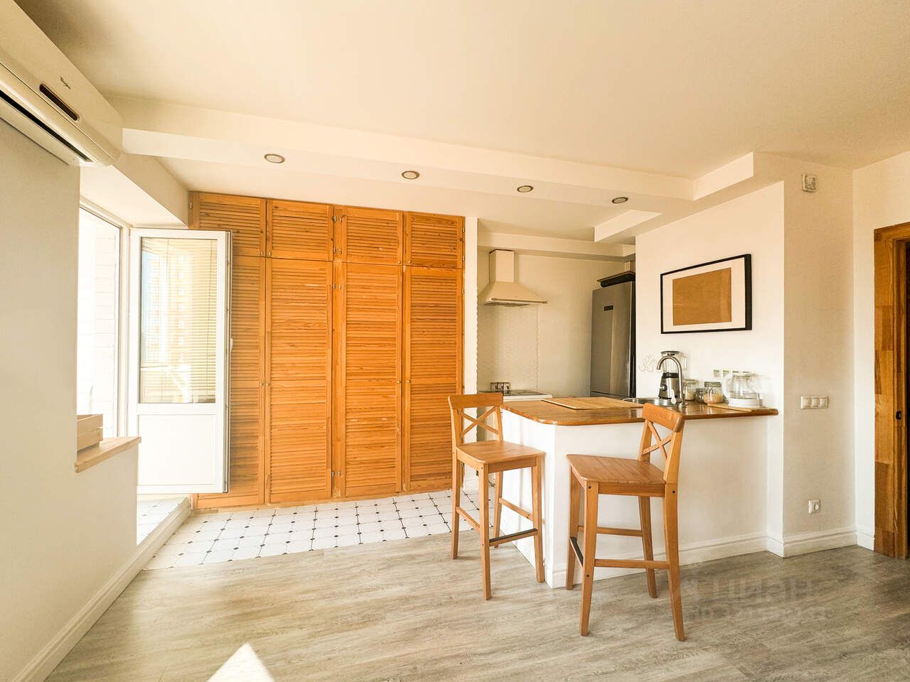 вместительный шкаф для вещей, кухня с необходимой техникой, барная стойка с