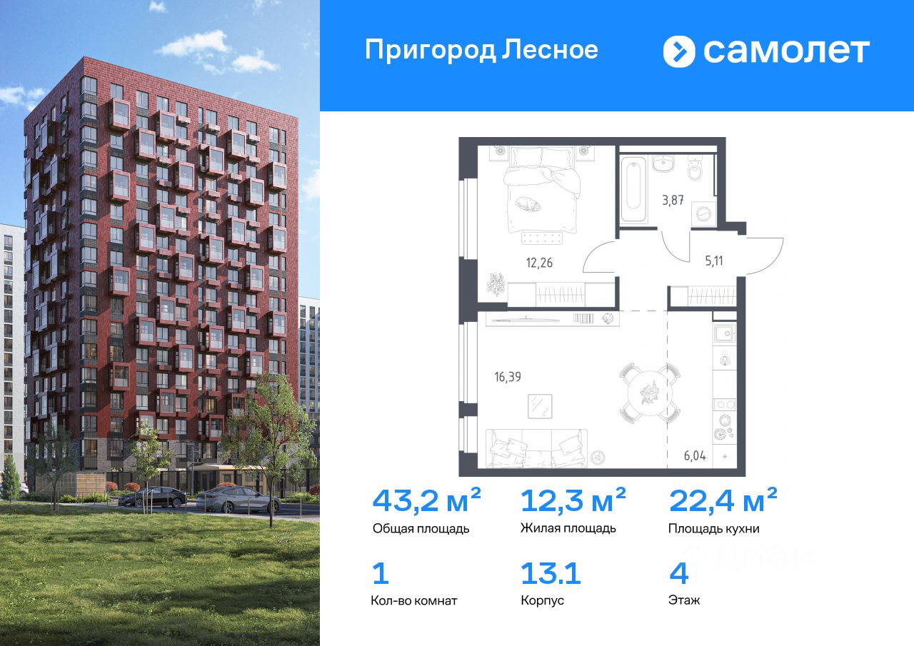 Предлагается 1-комнатная квартира комфорт-класса 43,2 кв.м в корпусе 13.1 на 4 этаже, в ЖК ''Пригород Лесное'' Квартира с чистовой отделкой. Доступность дополнительных опций уточняйте у застройщика.