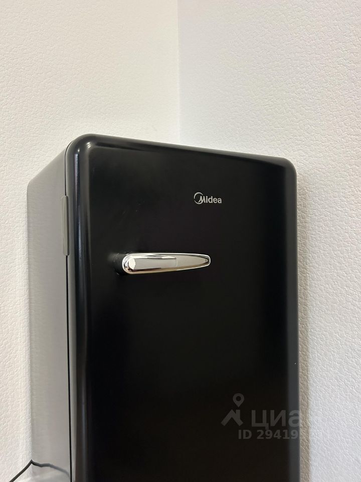 Так же я купила стильный холодильник, чтобы не было ощущения жизни на кухне. Здесь же ты найдешь стиральную машинку. Она небольшая, как раз для 1-2 людей.